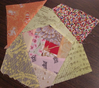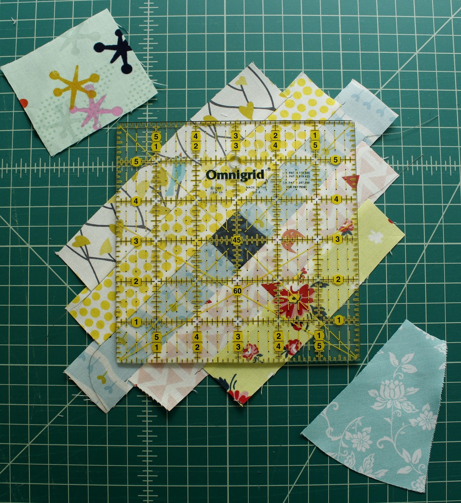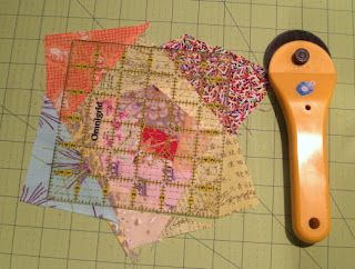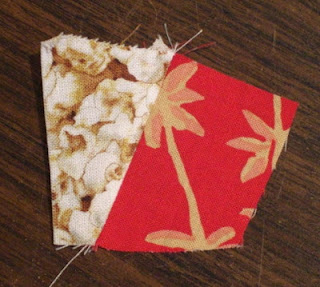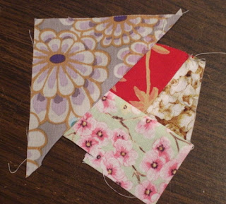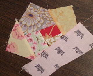 Cut 5 blocks: 3" x 3," as shown above. Cut one block on the diagonal (it can be a dark or a light).